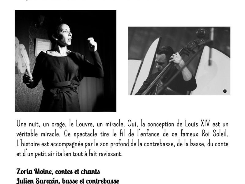 Une nuit, un orage, le Louvre, un miracle. Oui, la conception de Louis XIV est un véritable miracle. Ce spectacle tire le fil de l'enfance de ce fameux Roi Soleil. L'histoire est accompagnée par le son profond de la contrebasse, de la basse, du conte et d'un petit air italien tout à fait ravissant.